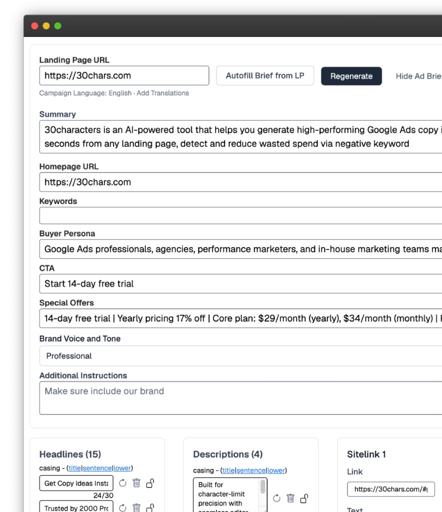 Build a lot of ads at once input a list of landing page urls with instructions and receive a list of ads. Great for setting up a bunch of campaigns or ad groups.