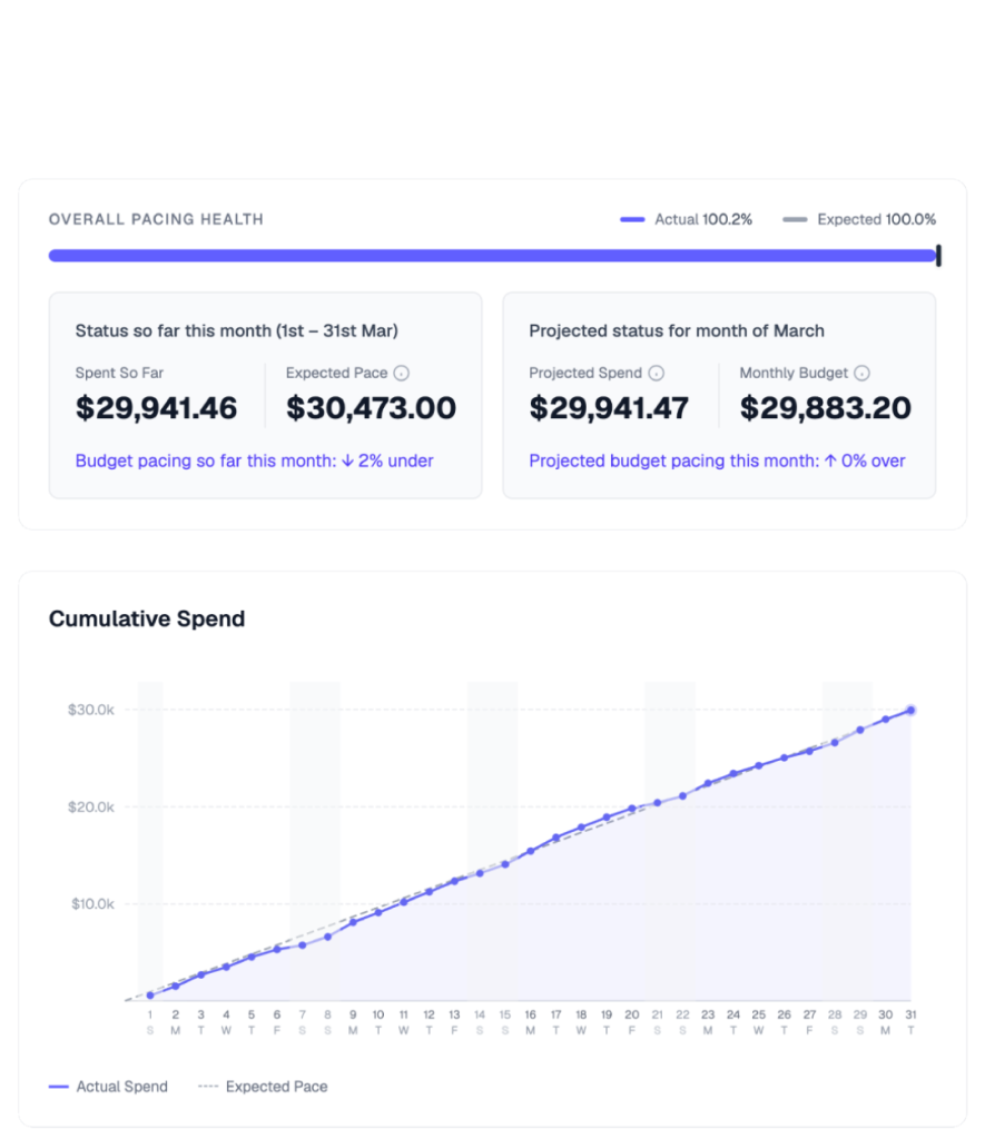 Visual daily spend chart showing actual vs. expected pace for chart each campaign and your account overall.
