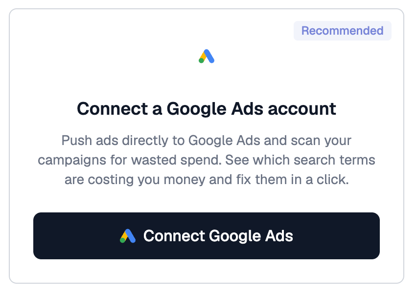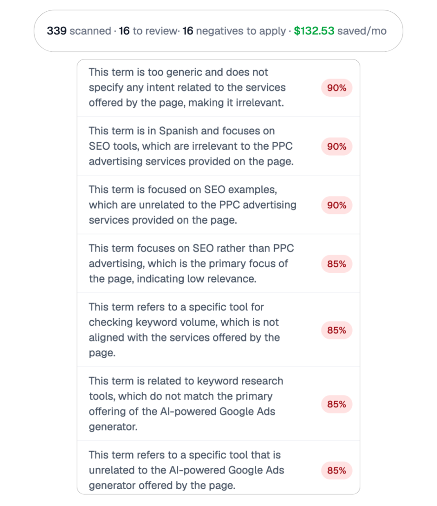 Find waste spend automatically connect your Google Ads account and our AI will regularly scan your search term reports to surface the clicks that are costing you money without results.
