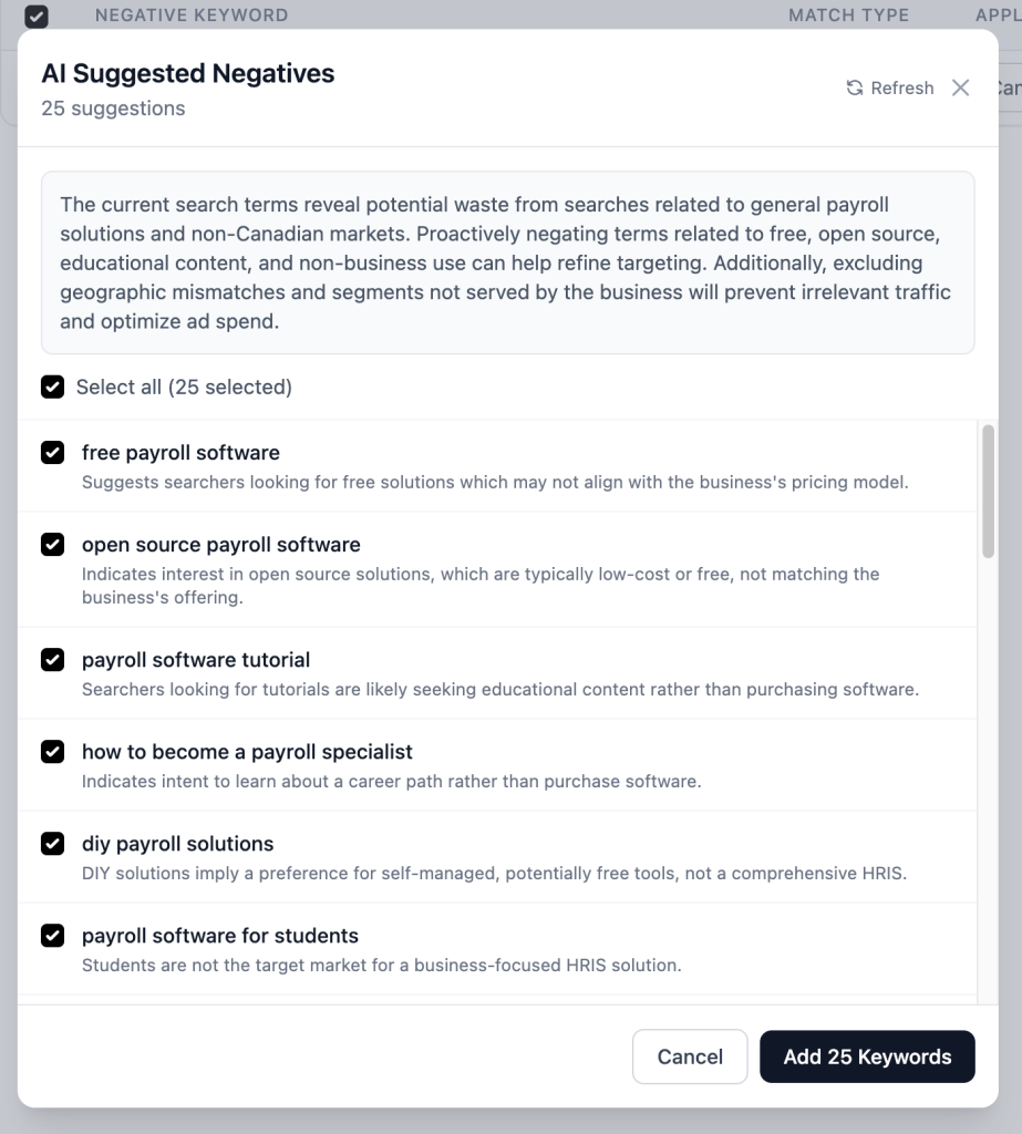 After running a negative keyword scan, you can now get AI-suggested negatives based on your business context and the search terms you picked to negate.