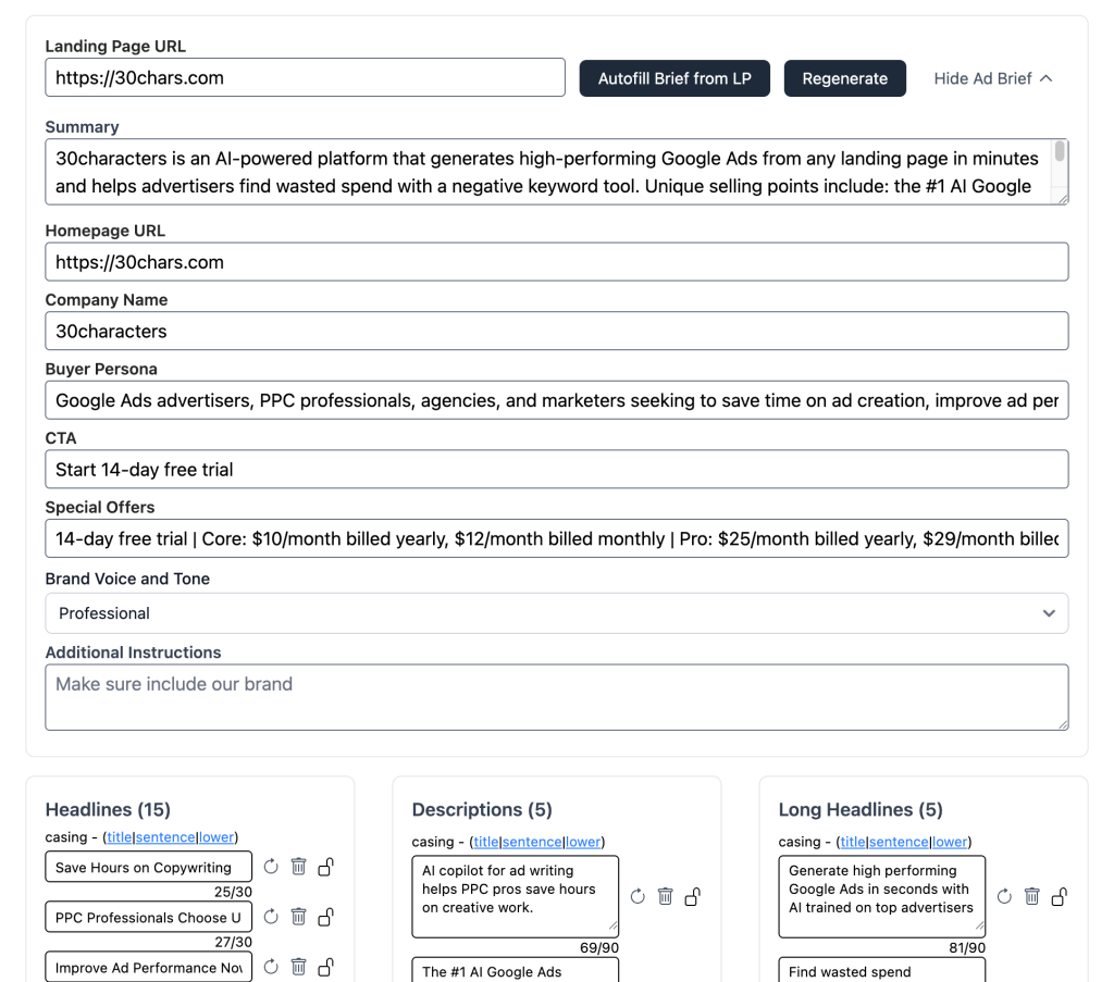 Ads also adapt to your campaign type (Search, PMAX, Demand Gen) and pull in location details if you’re a local business. The output is noticeably better across the board.