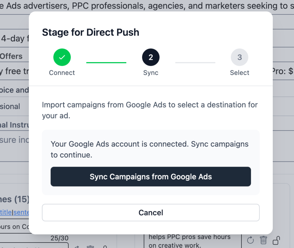 Staging ads for Google Ads is now a guided 3-step flow: connect your account, sync a campaign, and select your destination. All without leaving the page. No more bouncing between screens.